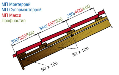 Обрешетка с шагом 500 мм устанавливается для кровельного профнастила С-21х1000, НС-35х1000, МП-20х1100. Толщина досок обрешетки должна быть больше, если между стропилами есть пространство более1000 мм. Обрешетка может быть и сплошной. Обычно такой тип обрешетки используется в ендовах, вокруг мансардных окон и дымоходов.