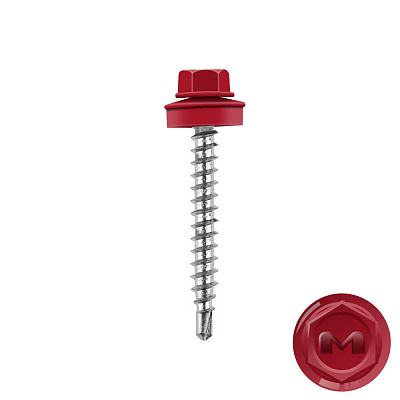 Кровельные саморезы Daxmer (Даксмер) по дереву цветом RAL3003 Рубин 4,8*35мм окрашиваются УФ-стойкой полиэфирной порошковой краской. Цинковое антикоррозийное покрытие обеспечивает длительный срок службы саморезов (не менее 25 лет). Специальная металлическая шайба с ЕРDМ - уплотнителем обеспечивает плотное прилегание профилированного металла (кровли) к деревянной обрешетке, а также препятствует попаданию влаги.