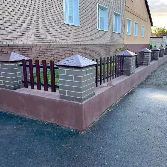 Полимерпесчаный колпак коллекции Everest (Эверест) в классическом коричневом цвете, установленный на столбах кирпичного забора вокруг палисадника. Изделие гармонично дополняет кладку, подчеркивает аккуратные линии ограждения и придает конструкции завершенный внешний вид. Практичный материал обеспечивает долговечность и надежную защиту кирпича от осадков, а стильный оттенок коричневого органично вписывается в общий архитектурный облик.